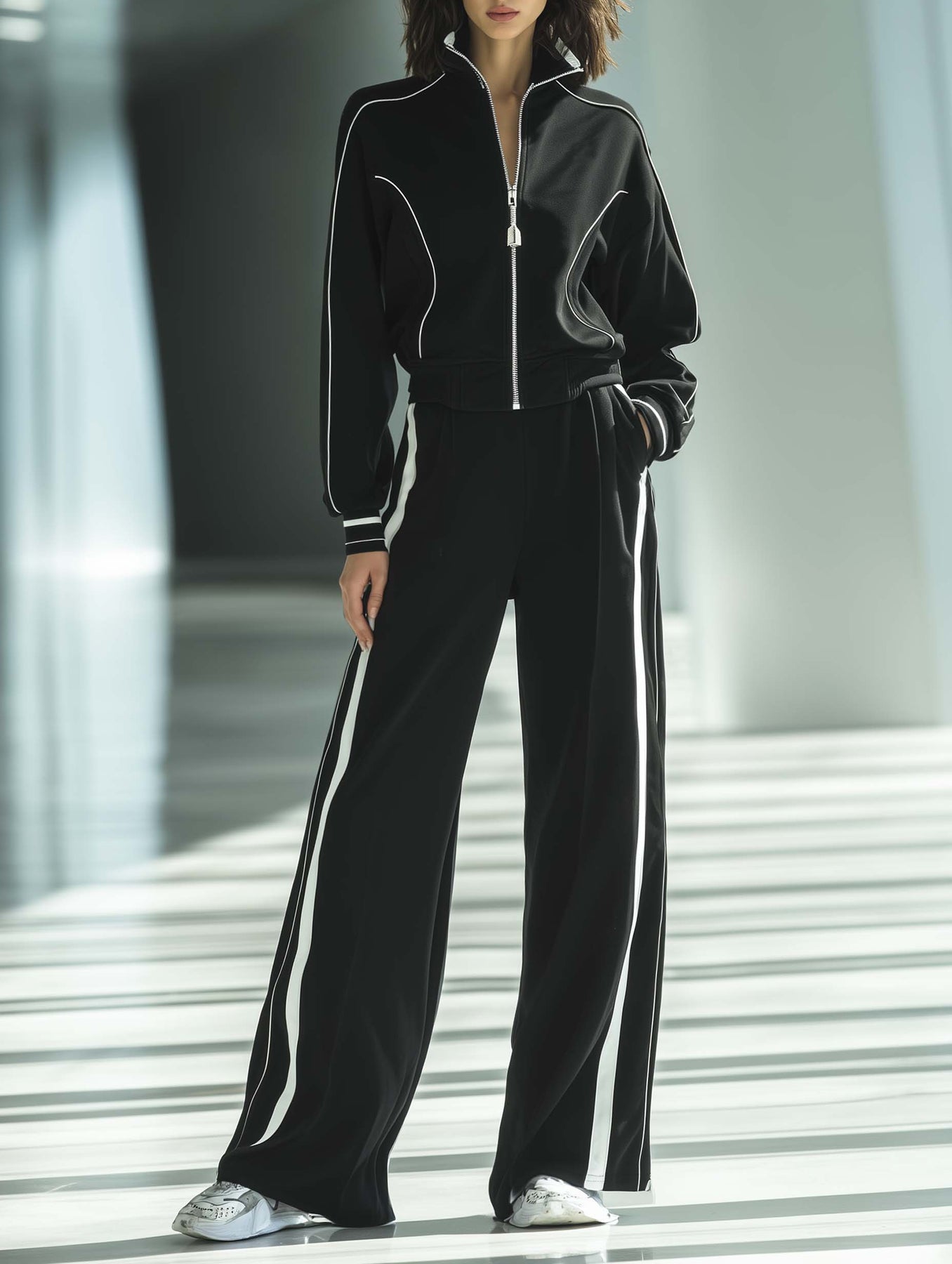 This Women's Fashionable Casual Style Black Top And Trousers Set with White Piping exemplifies modern elegance with a minimalist touch. The set includes a sleek black top and matching trousers, both featuring delicate white piping that adds a subtle yet striking contrast to the overall monochromatic look.
